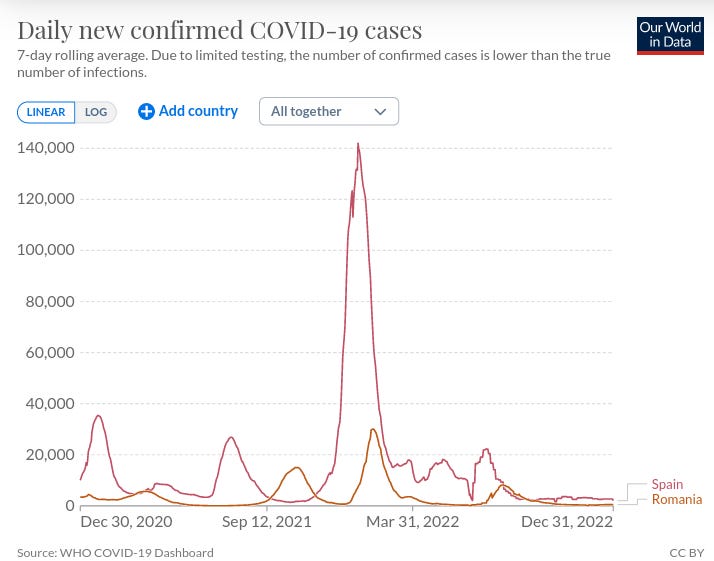 ... and had finally wrestled its new case rate down to four times as high as that of Romania, a country which managed to jab less than 30 per cent of its population. So yeah, how's that "containing the pandemic" thing working out for you guys over there in Spain?