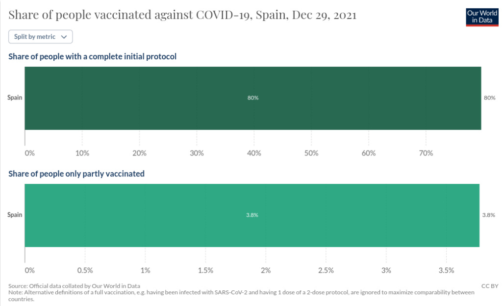 Oh, is that so? Well, by the end of 2021, 80 per cent of Spaniards were 'fully vaccinated' according to the then-current definition (remember when two shots was all you needed to be fully vaxxed?), while another 3.8 per cent were 'partially vaccinated'...