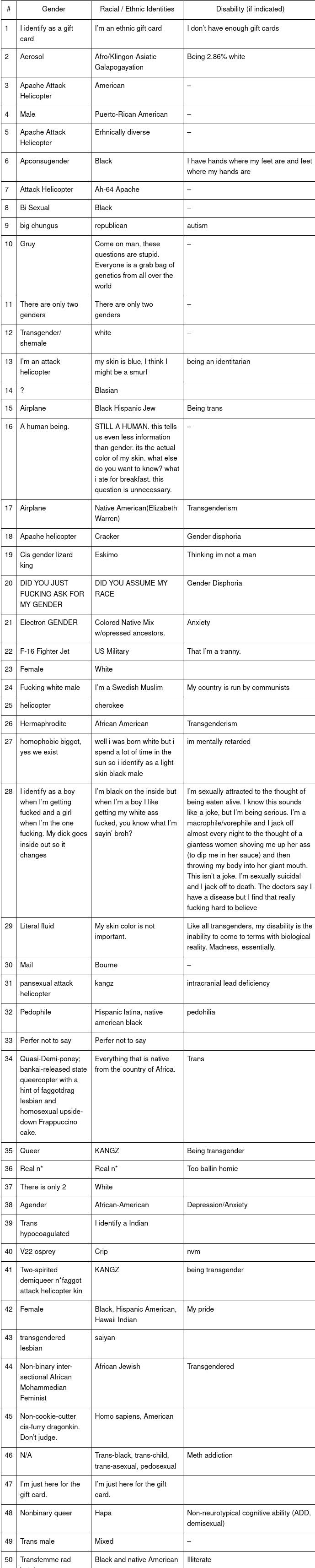 By the way, in case you're wondering why so many respondents listed variants of 'attack helicopter' as their gender, it's a popular internet meme which originated in the online gaming subculture and rapidly spread through the weirder reaches of the internet, such as Reddit and 4chan. The meme parodies the gender and sexual identification posts frequently seen on other online fora, by substituting the desire to be an attack helicopter for the desire to change one's sex: