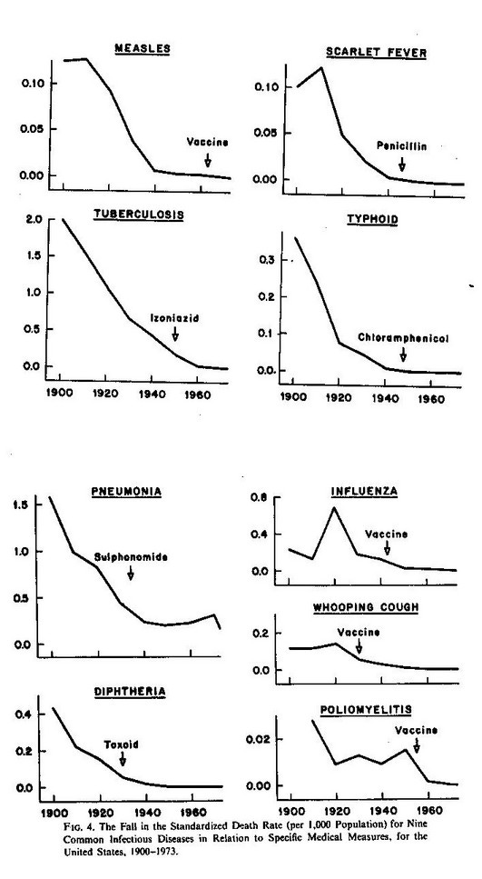 As every student of public health learns, by far the largest percentage of the precipitous declines in death rates from infectious diseases that occurred in the twentieth century, was accrued long before there were any effective medical interventions. Tuberculosis, whooping cough, scarlet fever, typhoid, diphtheria and measles had all but disappeared as causes of death in Westernised countries, long before antibiotics, toxoids and vaccines were developed to treat or prevent them.