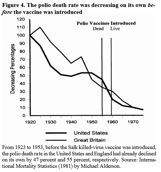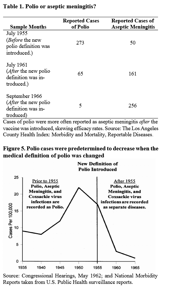 And the case definition of poliomyelitis was changed after the polio vaccination campaign began, such that the apparent steep decline in polio mortality after widespread vaccination was largely artefactual; cases of paralysis that were previously attributed to “polio” were now classified as aseptic meningitis and coxsackievirus infections.