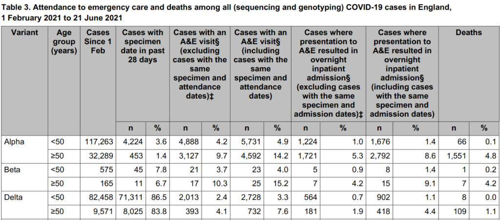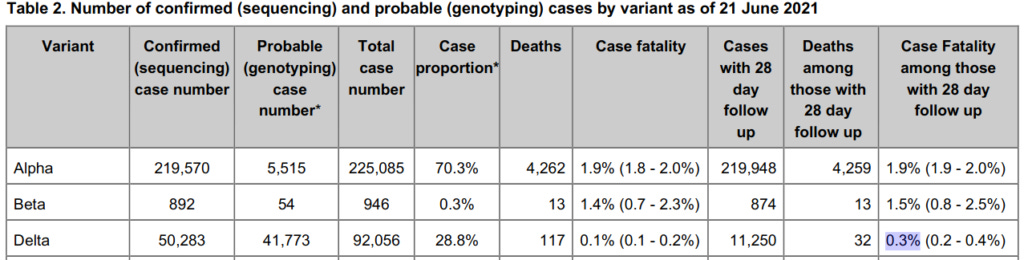 By the way, the comparison of hospitalisation and death rates in the post-vaccine vs pre-vaccine era is disingenuous, as data from Public Health England (which leads the world in genomic sequencing of SARS-CoV-2) clearly show that the Delta strain of SARS-CoV-2, which became dominant after mass vaccination began, is less virulent (capable of causing serious disease) than the pre-vaccine era strains: