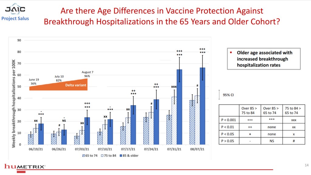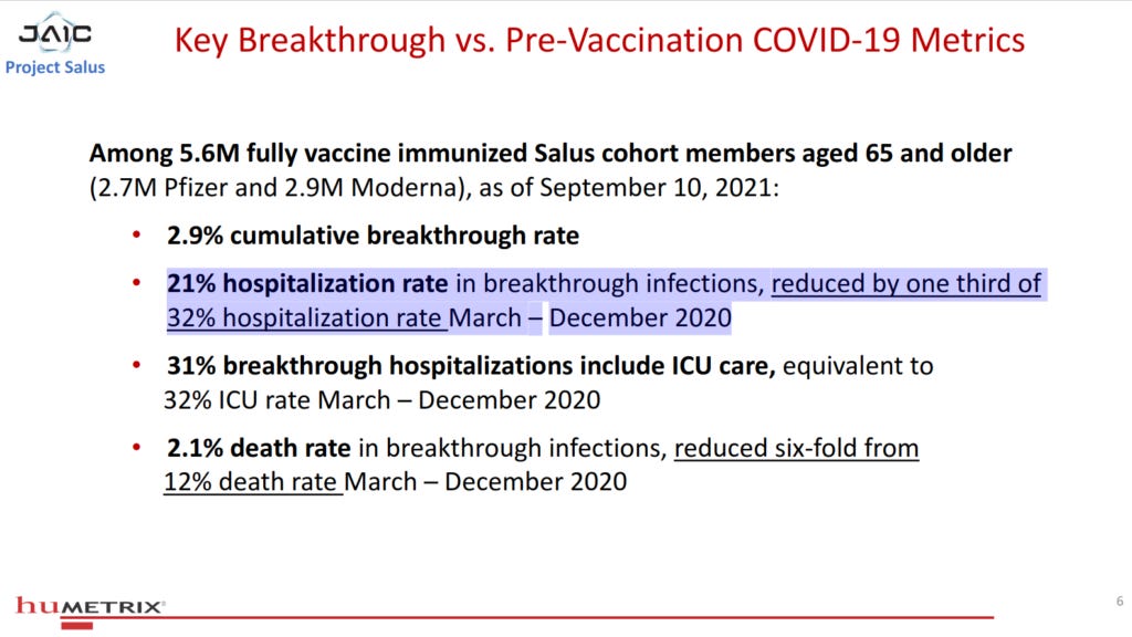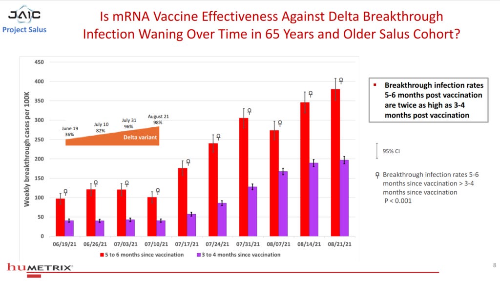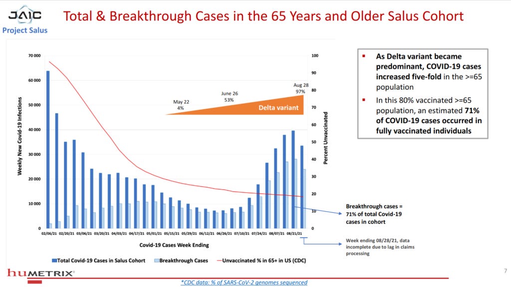 Further on in the presentation, we see that the percentage of SARS-CoV-2 infections that are classified as breakthrough cases (infections that are diagnosed at least 14 days after the second shot of the Pfizer or Moderna products) has risen precipitously since the Delta variant gained predominance, such that “in this 80% vaccinated >=65 population, an estimated 71% of COVID-19 cases occurred in fully vaccinated individuals”: