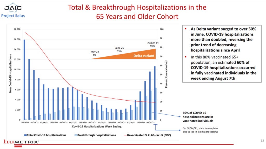 Meanwhile, “in this 80% vaccinated 65+ population, an estimated 60% of COVID-19 hospitalizations occurred in fully vaccinated individuals” in the week ending August 7th: