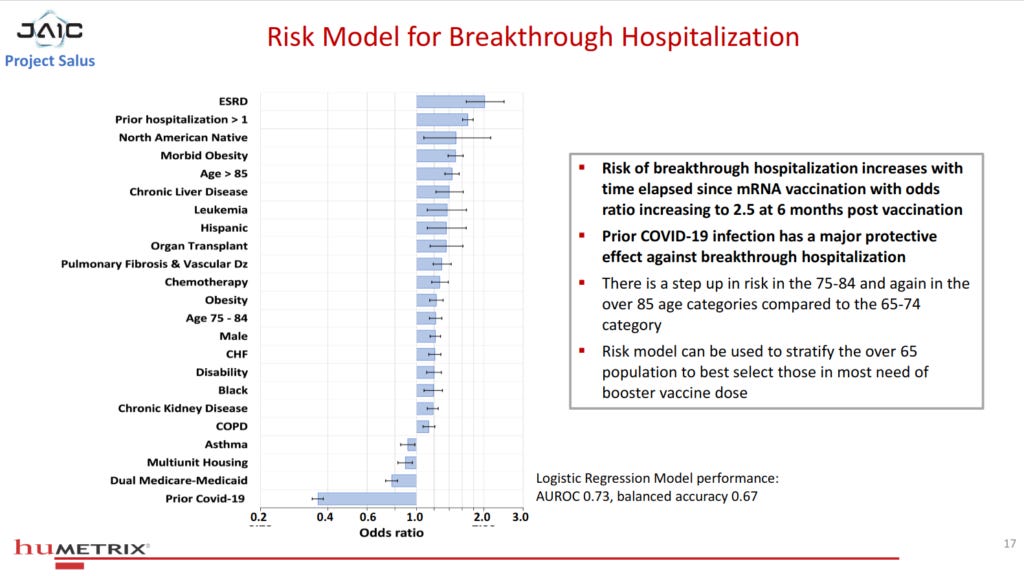 Finally – no surprises here – you’re most at risk of being hospitalised for COVID-19 despite being “fully vaccinated” if you’re really old, really sick, really fat, or from a minority ethnic group, whereas having natural immunity from prior infection keeps you out of hospital:
