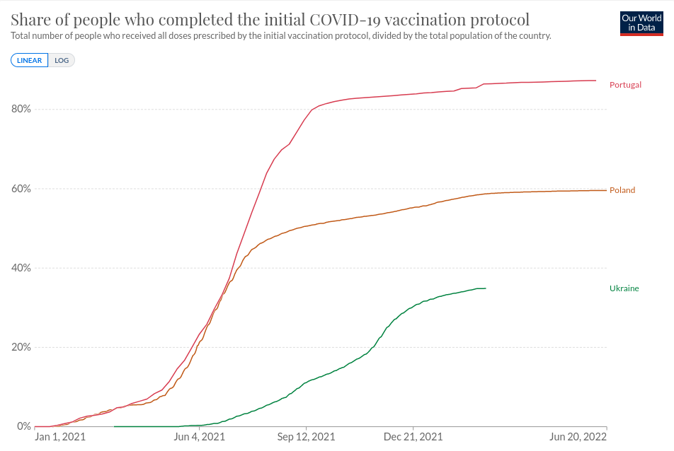 To demonstrate, let’s compare three European countries: Ukraine, its neighbour Poland, and Portugal. While Portugal is renowned as the country in which there is “no one left to vaccinate”, Ukrainians are notoriously leery of vaccines in general leading to Ukraine having one of the lowest COVID-19 injection rates in Europe. Poland is in between:
