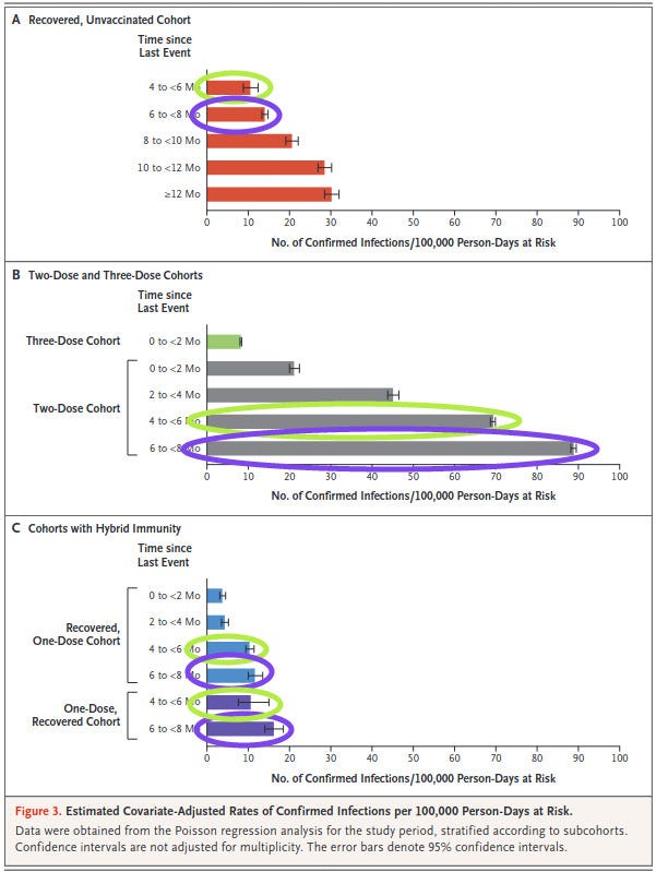 “The resulting crude rates of severe disease among persons 60 years of age or older, without consideration of the time since the last immunity-conferring event, were 0.6 per 100,000 person-days at risk in the recovered, unvaccinated cohort, 0.5 in the recovered, one-dose cohort, 0.5 in the one-dose, recovered cohort, 4.6 in the two-dose cohort, and 0.4 in the three-dose cohort.”