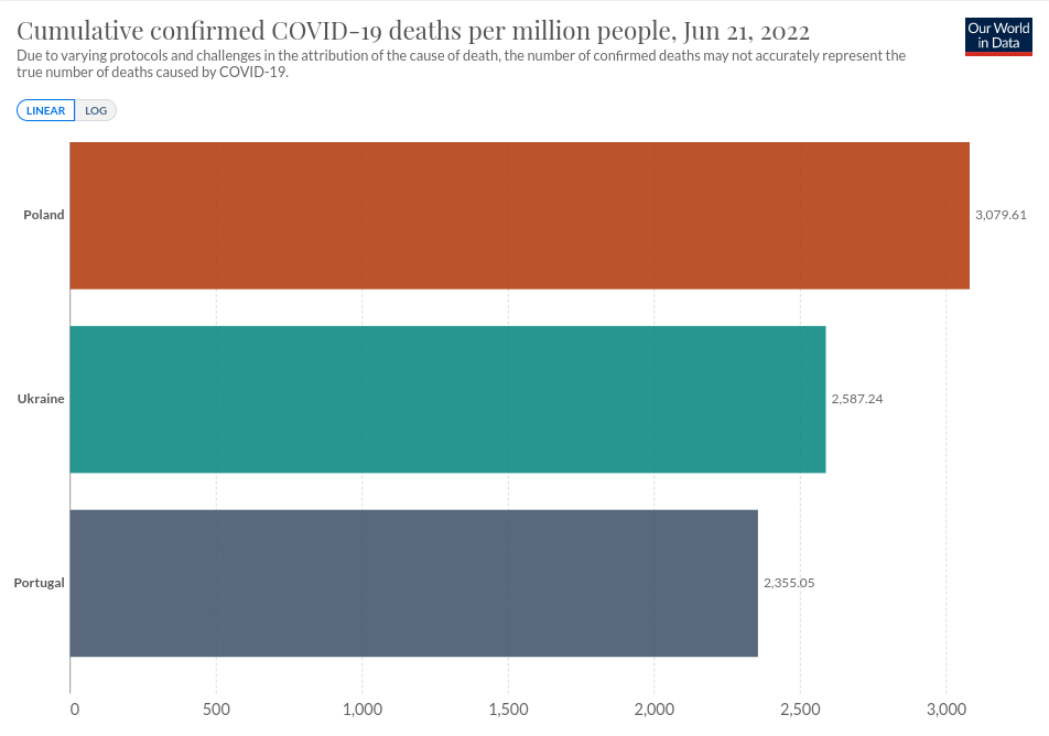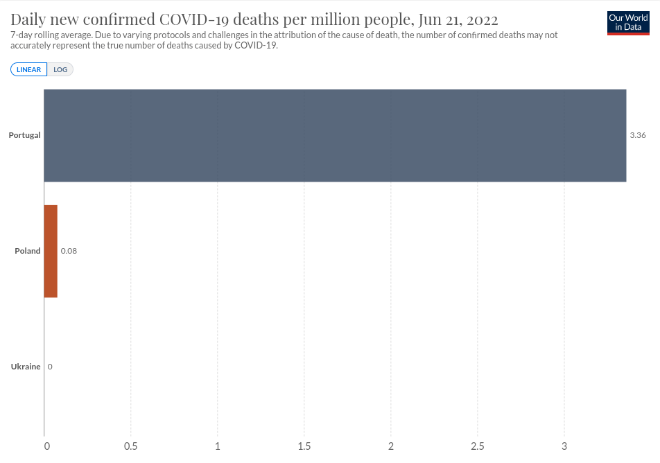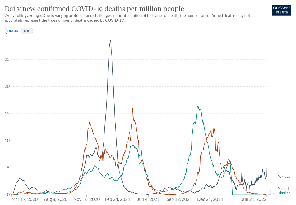 But while virtually no one is dying of COVID-19 anymore in Ukraine1 or Poland, Portugal’s summer spike was accompanied by a wave of deaths which is only just beginning to subside: