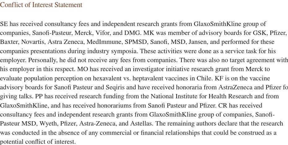 The vaccine true believers hold fast to the notion that all we have to do to solve these problems is to develop better acellular pertussis vaccines. (Of course they do. Check out the Conflict of Interest notice on the WAidid/EVASG report:)
