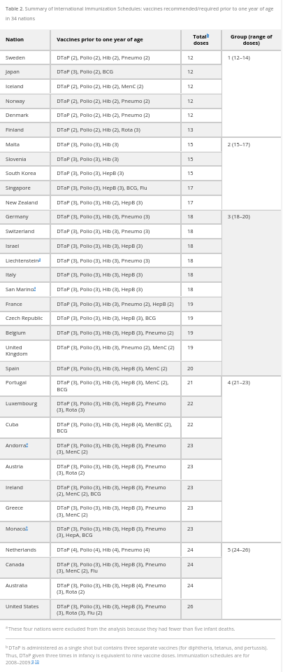 The 34 countries selected for this analysis were the US – which, at 26 vaccine doses for infants aged less than 1 year (as of 2011), has both the most intense vaccination schedule and the highest per capita spend on health care in the world – and the 33 countries that have a lower IMR than the jabbed-to-the-eyeballs leader of the free world.