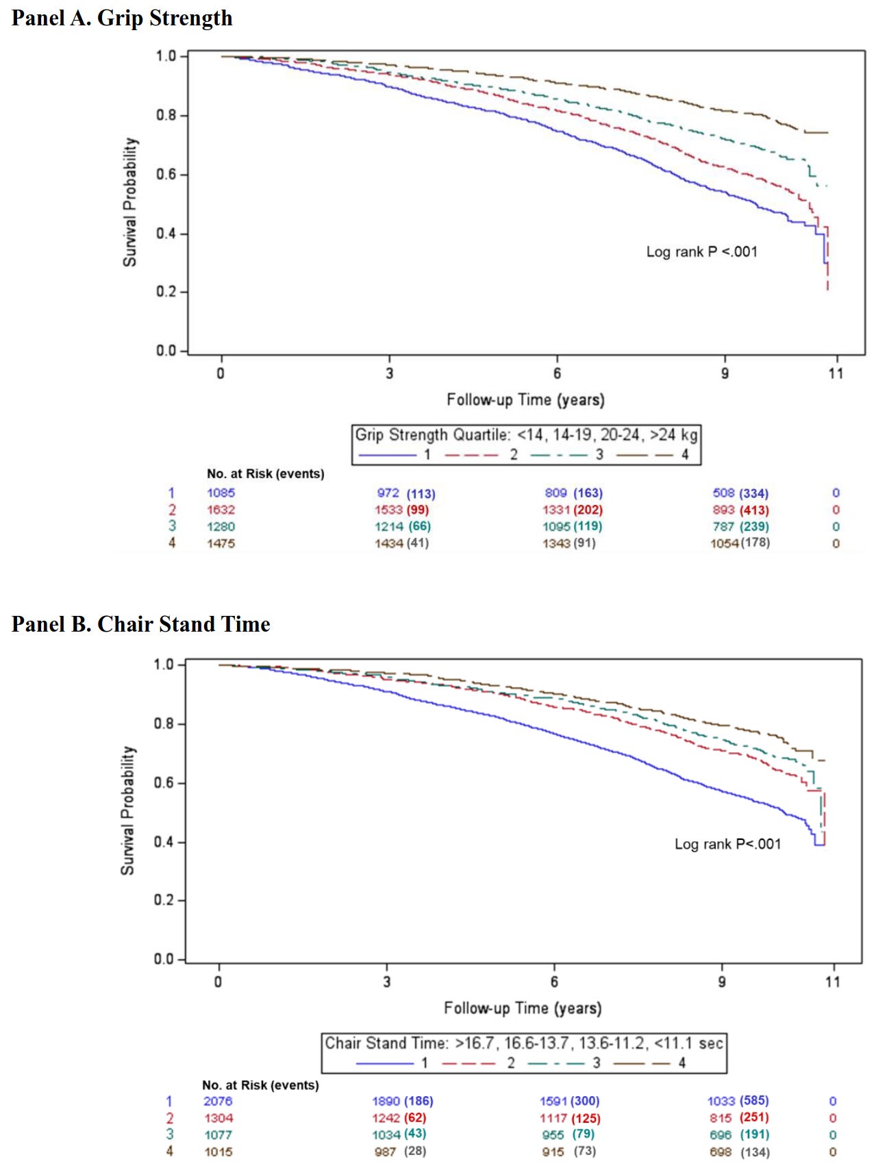 Check out the Kaplan-Meier survival curves below. Most of the strongest participants are still alive at the 11-year mark, while the majority of the weakest are dead: