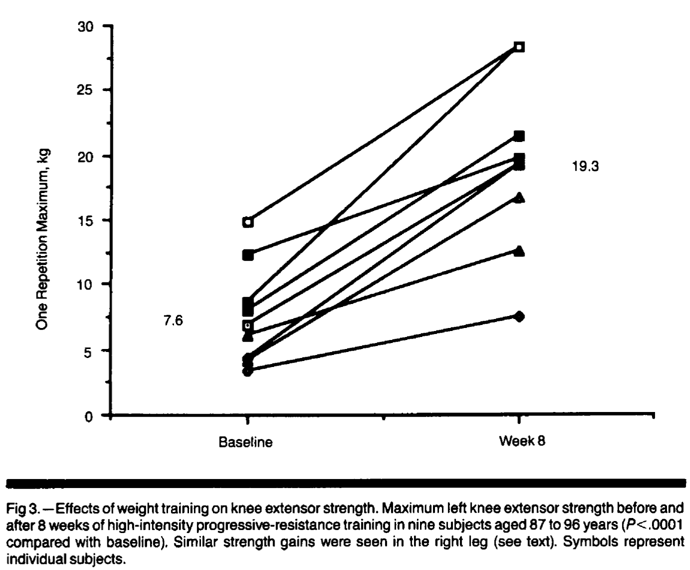 “The favorable response to strength training in our subjects is remarkable in light of their very advanced age, extremely sedentary habits, multiple chronic diseases and functional disabilities, and nutritional inadequacies. The relationship we observed between muscle strength and fat-free mass suggests that preservation of fat-free mass, whether through activity or nutritional intake, is an important determinant of muscle strength in very old age. We hypothesized that disuse atrophy was the major contributor to the muscle dysfunction in these nursing home residents and that without altering any of the other factors, some reversal of the muscle weakness and atrophy would be possible. Our findings suggest that a portion of the muscle weakness attributed to aging may be modifiable through exercise.”
