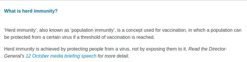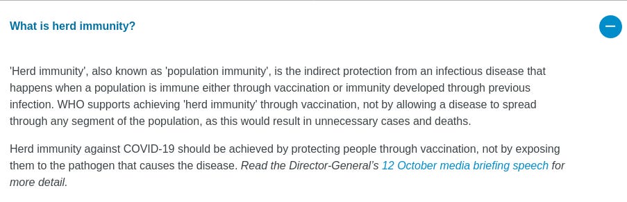 But by mid-November, WHO had attempted to shove the immunologically far-superior naturally-acquired immunity down the memory hole, insisting that only vaccination could confer herd immunity and that the concept itself was an artefact of the vaccine era (a demonstrably false statement, as the term was coined in the 1930s – over three decades before the measles vaccine was introduced - by A. W. Hedrich who meticulously documented the regular cycles of measles outbreaks in Boston and observed that measles all but disappeared when 68% or more of the children had acquired natural infection.