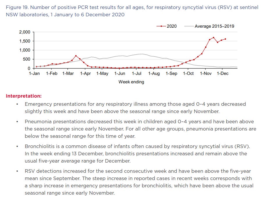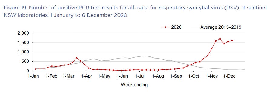 Likewise, respiratory syncytial virus (RSV), a common cause of respiratory infections in children, practically disappeared from Australia during the winter season when it normally circulates along with influenza viruses, coronaviruses, rhinoviruses and other lurgies: