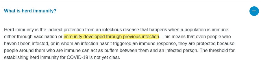 The change did not go unnoticed, and apparently embarrassed by the subsequent outcry, WHO changed the definition back again, throwing in a spurious argument that vaccine-induced immunity to SARS-CoV-2 would be ethically superior to naturally-acquired immunity:
