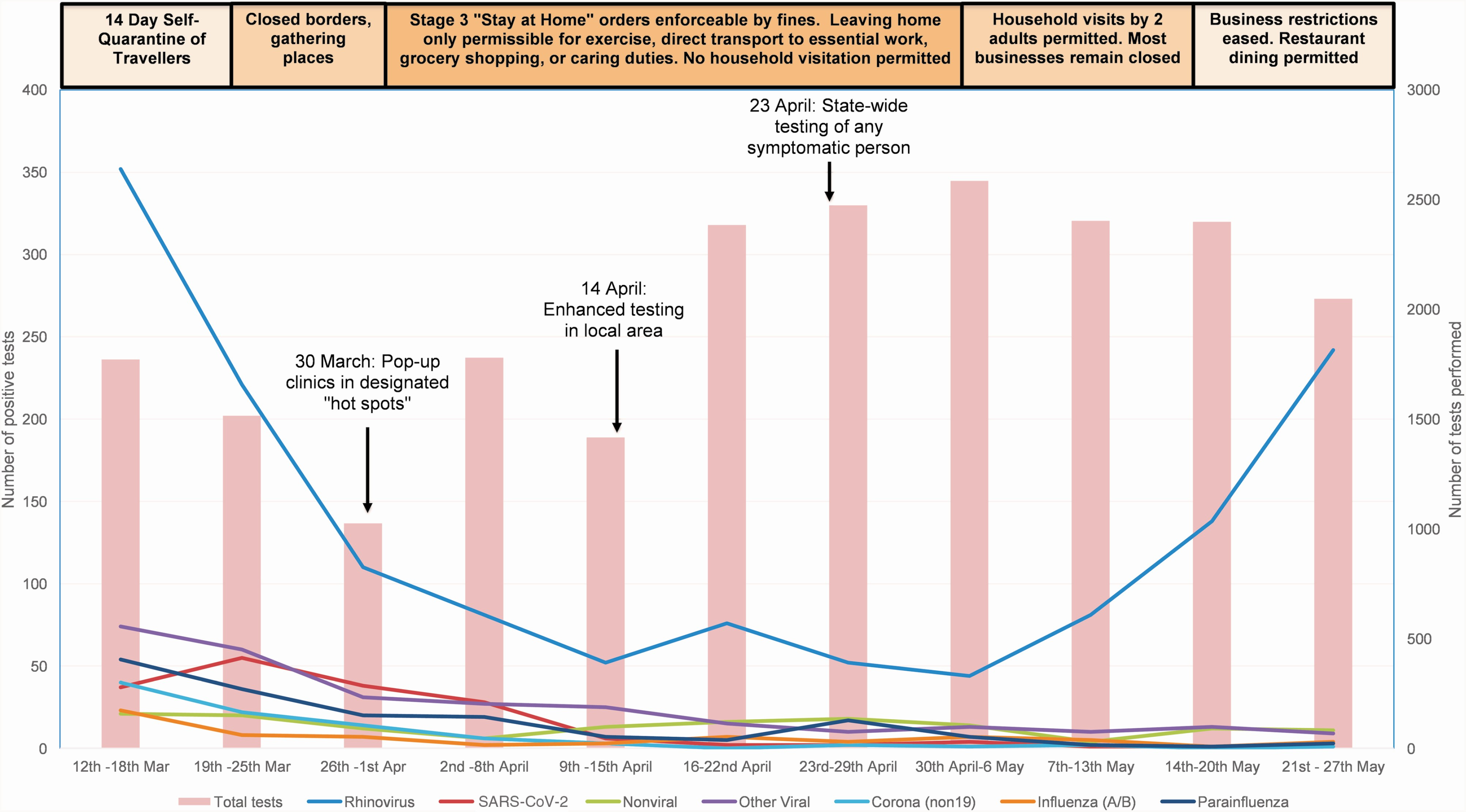 St Vincent’s Hospital in Sydney documented a dramatic decline in positive test results for an array of viruses that normally circulate in winter, causing coughs, colds and flu-like illness: