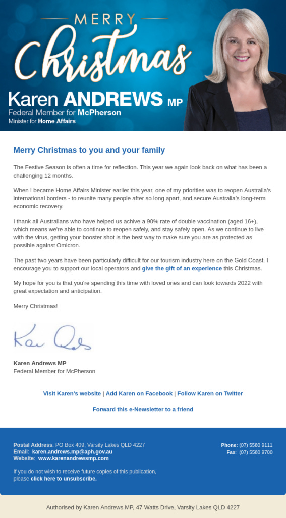 On 21 December 2021, I received the following generic Christmas email from Karen Andrews, Federal member for McPherson and Minister for Home Affairs in the Morrison government: