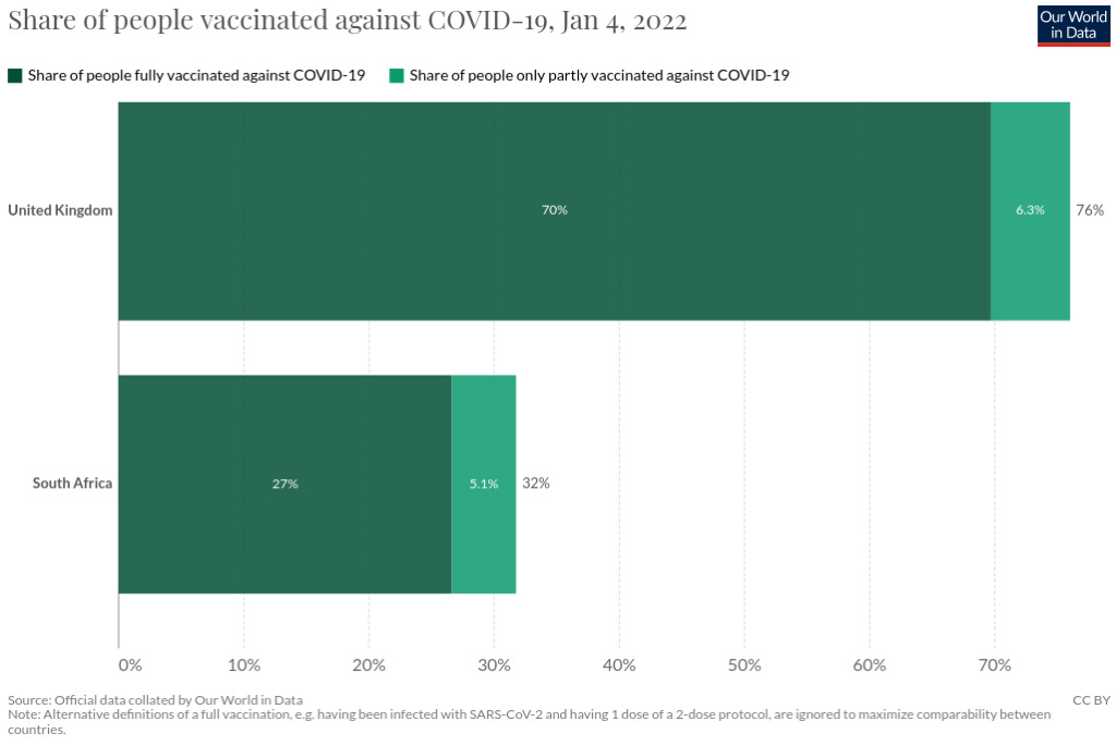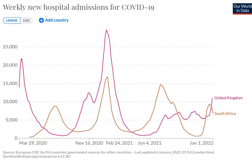 As for hospitalisations, South Africa (94% of sequenced samples now Omicron) is seeing falling hospitalisation rates despite not imposing any restrictions during the Omicron surge and having substantially less than half the vaccination rate of the UK: