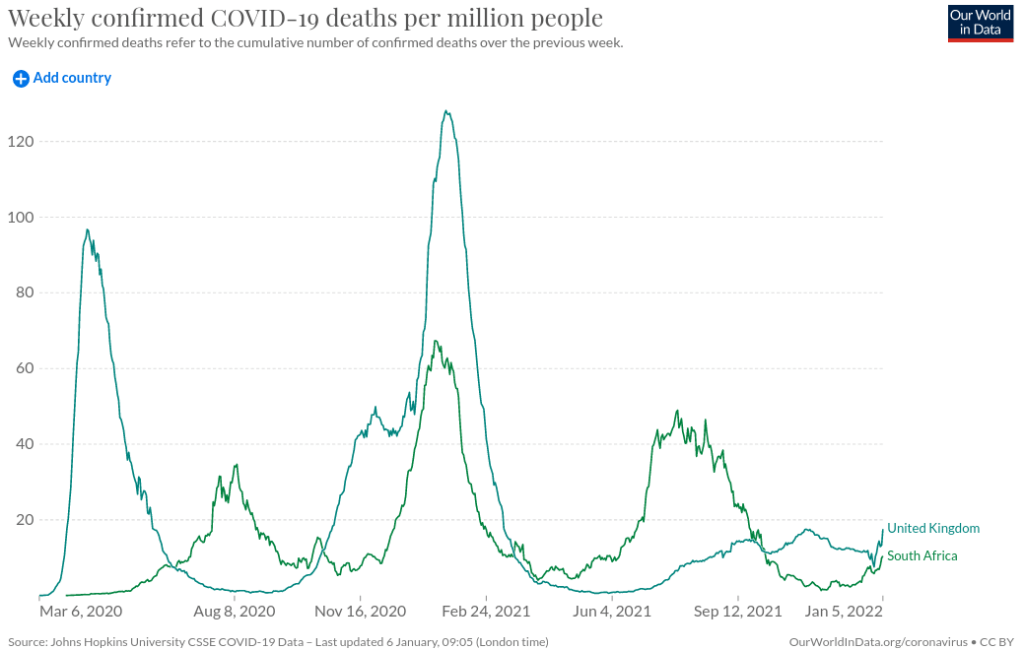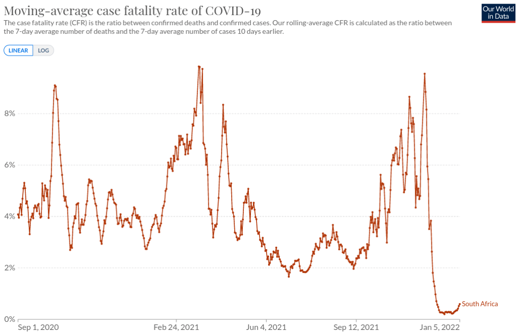 Just in case you missed the significance of that last point, let me spell it out for you: Omicron caused a massive spike in cases in South Africa and is now that country’s overwhelmingly dominant variant, which clearly means that is infecting both injected and uninjected individuals. However, with only 32% of the population double-jabbed and 27% single-jabbed, a relative handful of cases are severe enough to require hospitalisation, and the case fatality rate is lower than during any previous phase of the pandemic: