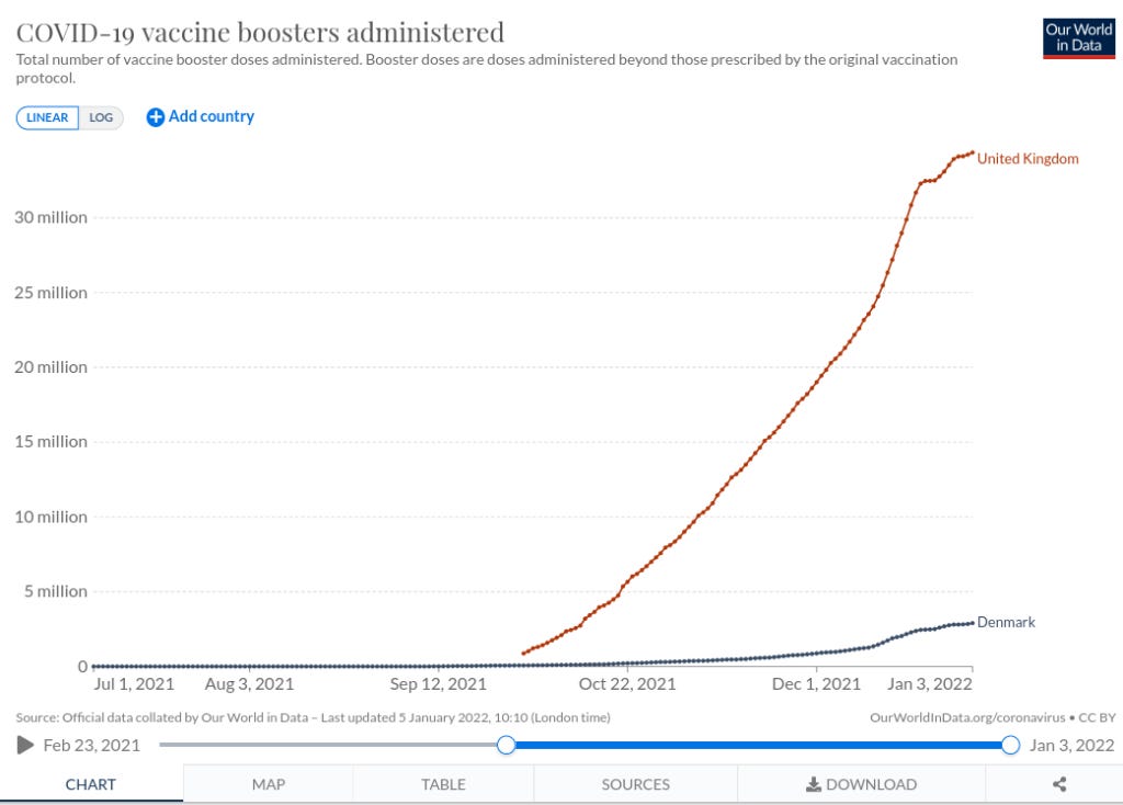 Why did the UK data show increased risk of Omicron infection in the boosted compared to the double-jabbed, while the Danish data showed the converse? Probably because the Brits began their booster program in earnest earlier than the Danes…