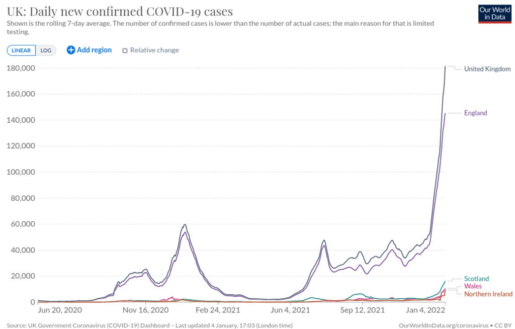 No, booster vaccination will most assuredly not avert a surge due to Omicron, no matter how high the uptake, as we can clearly see by examining the UK’s experience: highest new confirmed case count since the pandemic began, with 25,477,345 booster doses administered to a population of 68,430,562 [as of 6 January 2022], and 96% of sequenced cases now identified as Omicron: