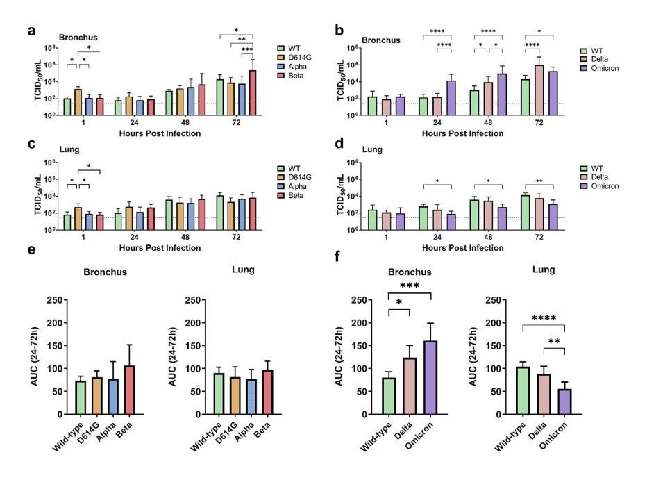 Viral replication kinetics of SARS-CoV-2 variants in ex vivo cultures of human respiratory tract. Human ex vivo cultures of bronchus and lung were infected with 5×105 TCID50/mL at 37°C. Virus released in the culture supernatants were measured over time by TCID50 assay. a, c. Viral replication kinetics of wild-type (WT), D614G, Alpha and Beta in human ex vivo cultures of bronchus and lung. b, d. Viral replication kinetics of wild-type (WT), Delta and Omicron in human ex vivo cultures of bronchus and lung. The horizontal dotted line denotes the limit of detection in the TCID50 assay. Bar-charts show the geometric mean (n=6) (SD). Statistics were performed using Two-way ANOVA followed by a Tukey’s multiple-comparison test. *p<0.05, **p<0.01, ***p<0.001, ****p<0.0001. e, f. Viral titers from a to d are depicted as area under the curve (AUC). Bar-charts show the geometric mean (n=6) (SD). Statistics were performed using One-way ANOVA followed by a Tukey’s multiple-comparison test. *p<0.05, **p<0.01, ***p<0.001, ****p<0.0001.