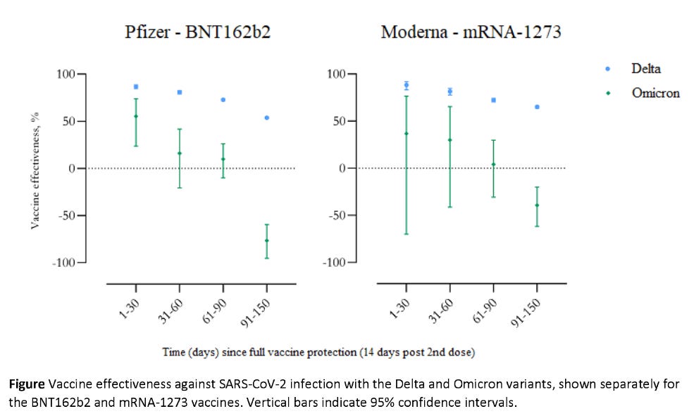 … and preliminary research has shown that initial protection against infection with the Omicron variant falls off a cliff within weeks, with vaccine effectiveness against Omicron being just 54.6% (little better than a coin flip) at 1-30 days after receipt of a Pfizer booster shot: