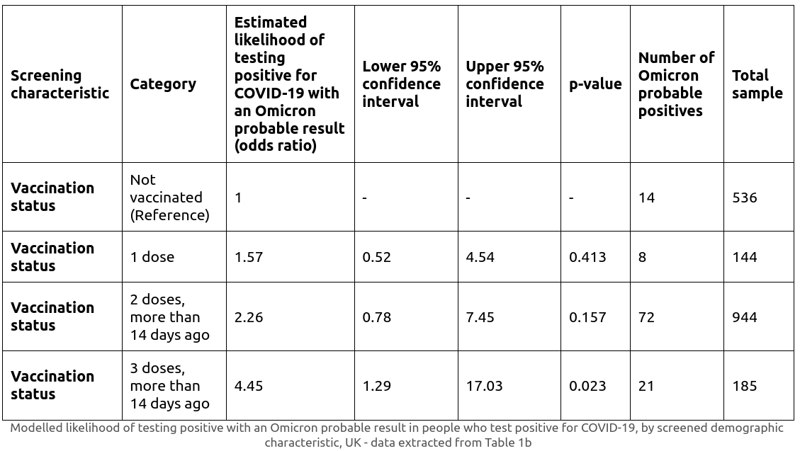 UK data indicate that “Those who have received three doses of a vaccine and test positive for COVID-19 are more likely to be infected with infections compatible with the Omicron variant compared with those who are unvaccinated”; the odds ratio of testing positive for COVID-19 with an Omicron probable result is 4.45 times higher in people who have received 2 COVID-19 vaccines plus a booster than in people who are unvaccinated.