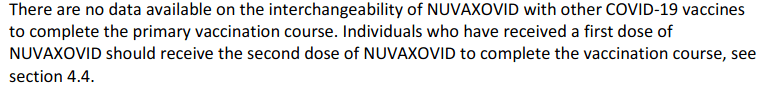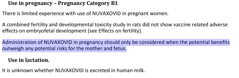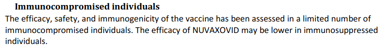 Update: The Philippines National Institute of Health recommended against the use of the Novavax in pregnant, breastfeeding and immunocompromised individuals, citing the lack of evidence of efficacy in these groups (since they were excluded from clinical trials) and the likelihood of an unfavourable risk:benefit ratio:
