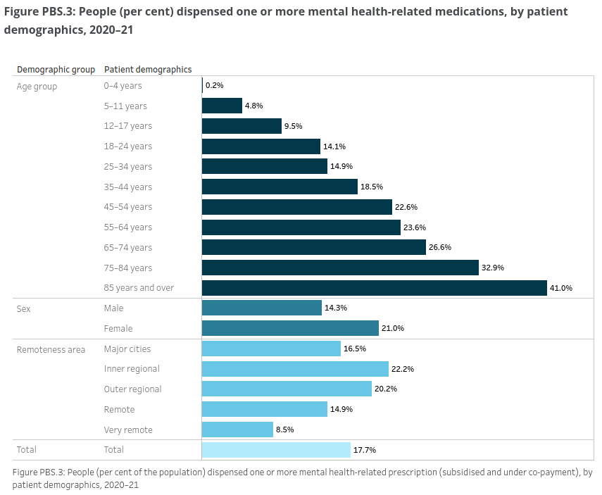 Also in 2020-21, 4.5 million individuals (17.7 per cent of the Australian population) filled a prescription for a 'mental health-related medication', with an average of 9.4 prescriptions per patient; 73.1 per cent of these mental health-related prescriptions filled were for antidepressant medications. Females are one and a half times as likely to be prescribed a 'mental health-related medication' as males, and the percentage of people on such brain-altering drugs rises stepwise with age; an astounding 41 per cent of Australians aged over 85 are on prescription medications for a (purported) mental health condition: