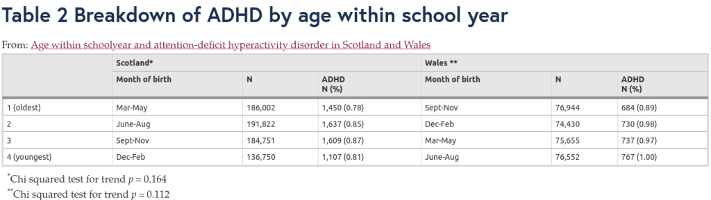 “If the children who were held back a year had been in their expected schoolyear, the prevalence of ADHD in Scotland across the four quartiles from oldest to youngest would have been: 0.79%, 0.89%, 0.97% and 1.01% (chi trend, p < 0.001).”