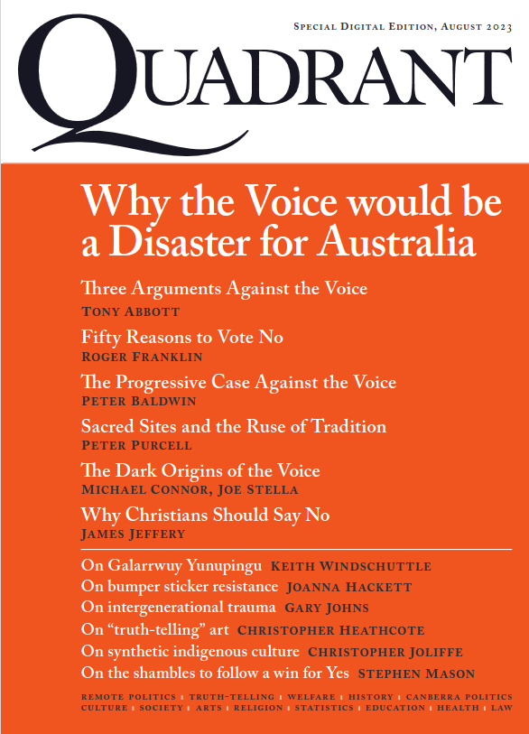 Since the Australian Government is not doing its job to ensure Australians are fully informed before casting their vote, Quadrant magazine has stepped into the breach, with a 213 page special digital edition, which features essays by historians, academics, journalists, former politicians, ministers of religion and informed members of the public, presenting the ‘no’ case.