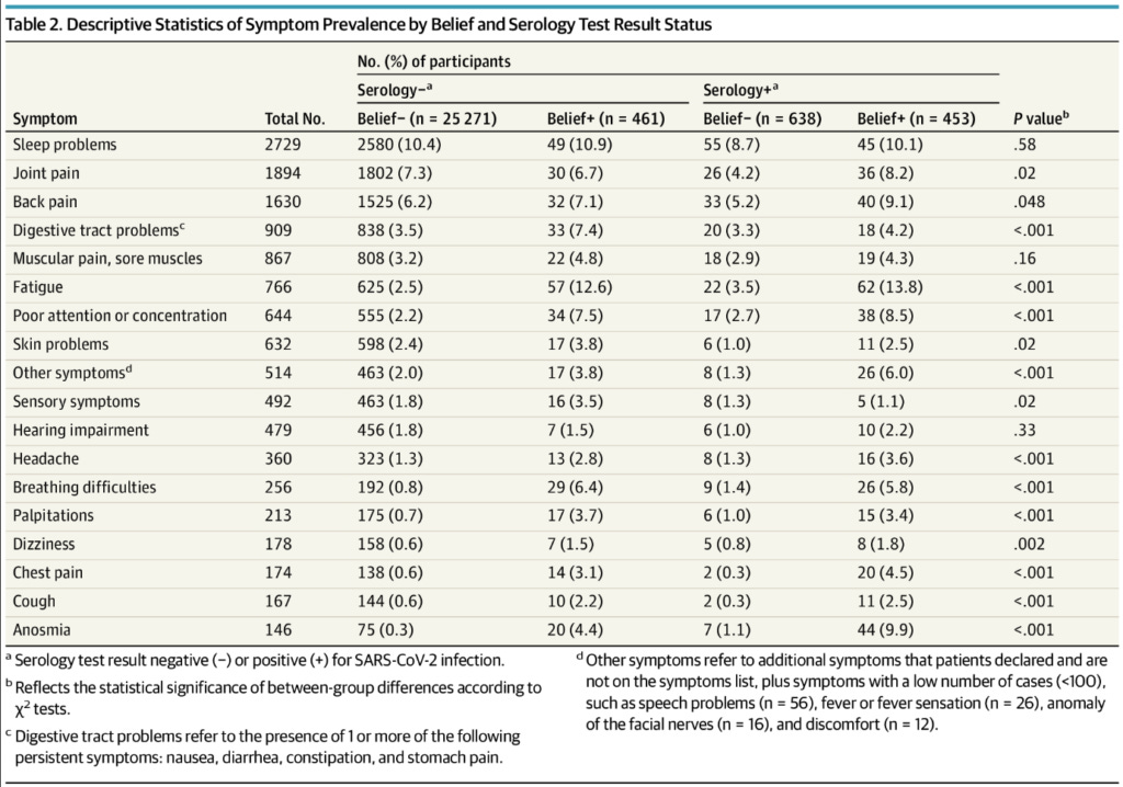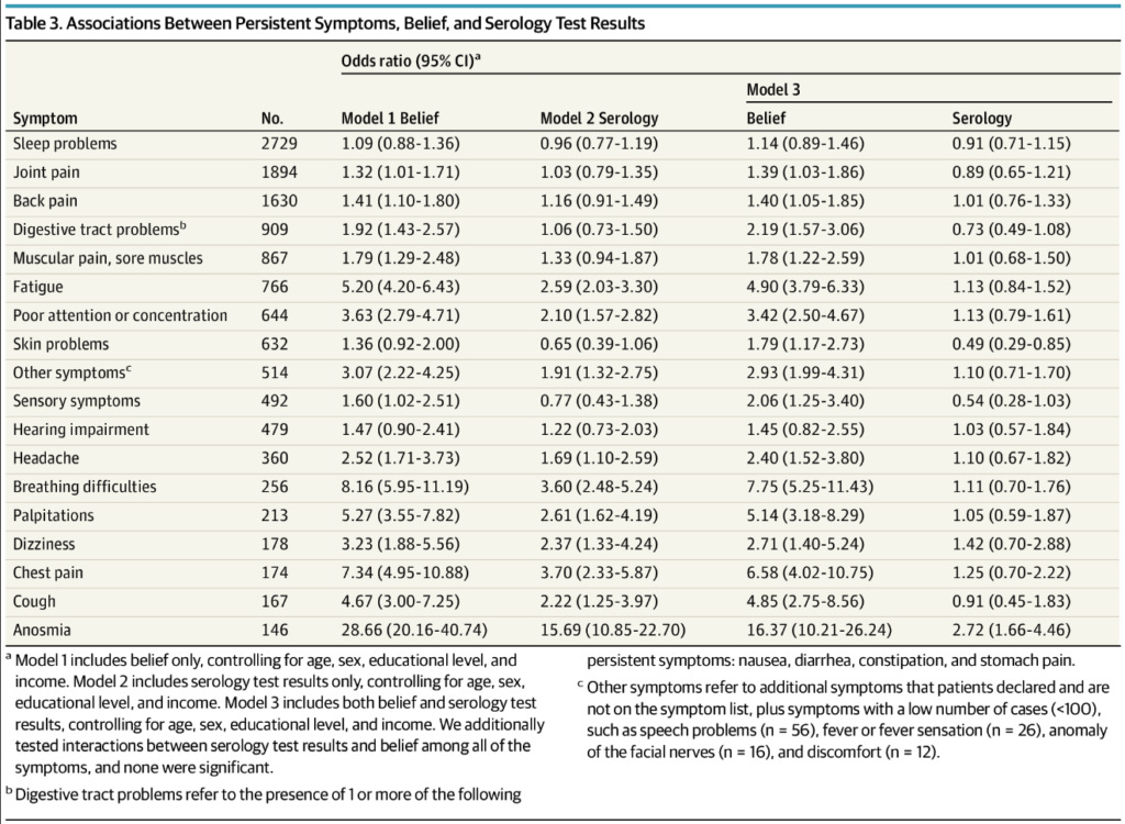 After mutual adjustment for belief and serology, the only persistent symptom that was actually more common in people who had laboratory-confirmed SARS-CoV-2 infection was anosmia, which is a well-known feature of actual COVID-19: