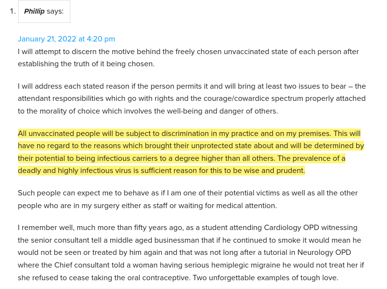 The fact that the injections don’t prevent infection with, nor transmission of, SARS-CoV-2 doesn’t even slightly mitigate the sanctimonious self-justification for completely abandoning the Hippocratic oath evinced by medicos like Phillip (below), so don’t delude yourself that someone this mired in ignorant, arrogant self-righteousness is going to acknowledge and attempt to treat your jab injury: