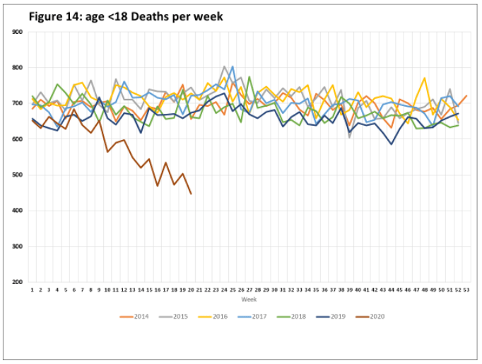 And here are the child deaths, compared to previous years; note the striking decline in under 18 deaths commencing in week 9 (late February):