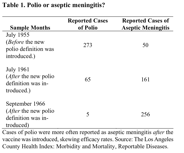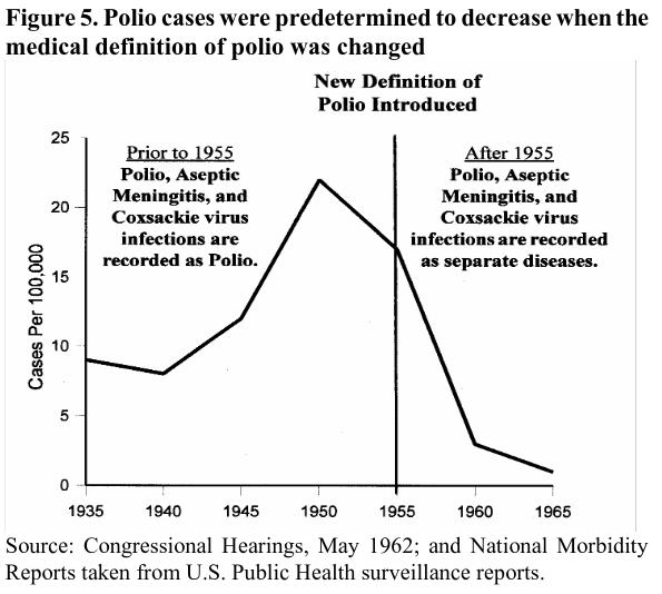 “Prior to the introduction of the vaccine the patient only had to exhibit paralytic symptoms for 24 hours. Laboratory confirmation and tests to determine residual paralysis were not required. The new definition required the patient to exhibit paralytic symptoms for at least 60 days, and residual paralysis had to be confirmed twice during the course of the disease. Also, after the vaccine was introduced cases of aseptic meningitis (an infectious disease often difficult to distinguish from polio) and coxsackievirus infections were more often reported as separate diseases from polio. But such cases were counted as polio before the vaccine was introduced. The vaccine’s reported effectiveness was therefore skewed (Table 1 and Figure 5).”