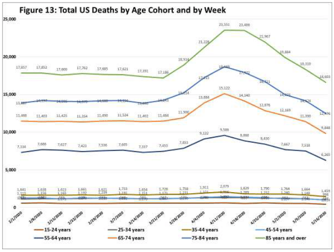 Well, not exactly. In the US, child deaths declined at precisely the same time-point that older age-groups suffered a sharp mortality spike. Here are the total US deaths broken down by age cohort and week, from February to May 2020: