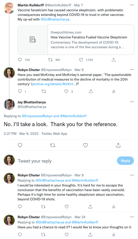 So wild that even the most heroic critics of damaging COVID containment policies, such as Drs Jay Bhattacharya and Martin Kulldorff, don’t dare to go there, as my Twitter exchange with them demonstrates: