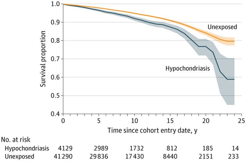 Diagnosed hypochondriacs died at an average age of 70, a full five years younger than the average age at death of people without hypochondriasis (75.1). The higher risk of death in hypochondriacs was evident from early in the follow-up period, as you can see from Figure 1 below: