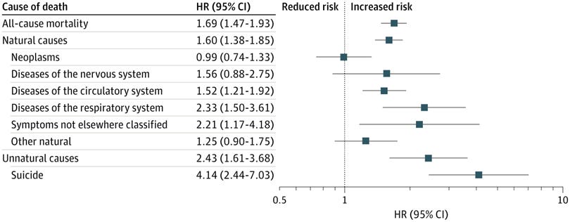 As you can see in Figure 2 below, people diagnosed with hypochondriasis were more likely to die of both natural causes (i.e. disease) and unnatural causes (e.g. suicide, homicide or accident).